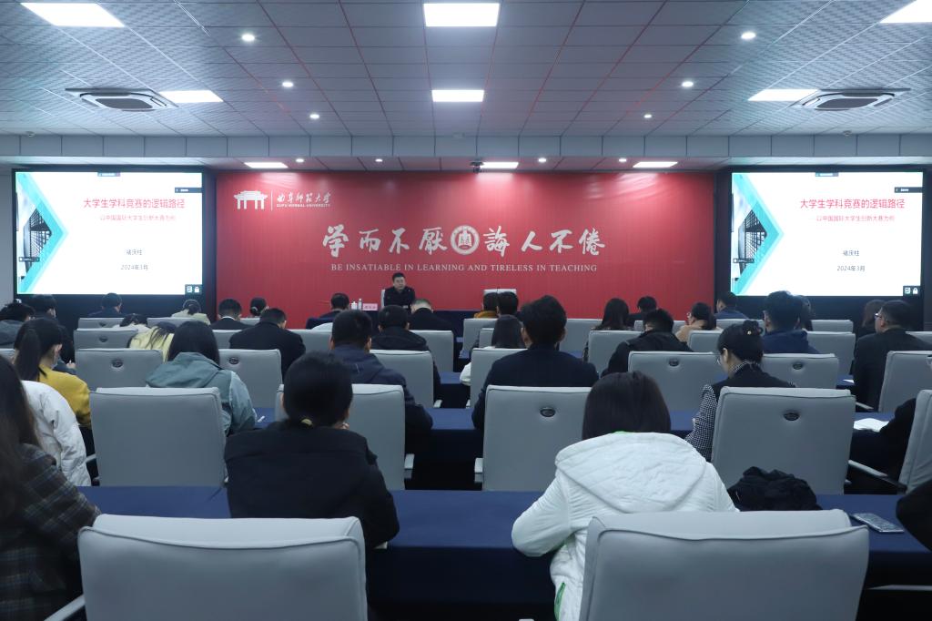 曲阜师大学生工作处讯  为提高曲阜师大参与学科竞赛的质量,激发广大师生参加学科竞赛的热情,积极推动学校学科竞赛工作,3月22日,青岛科技大学创新创业教育学院常务副院长褚庆柱受邀作了题为《大学生学科竞赛的逻辑路径——以中国国际大学生创新大赛为例》的专题报告。