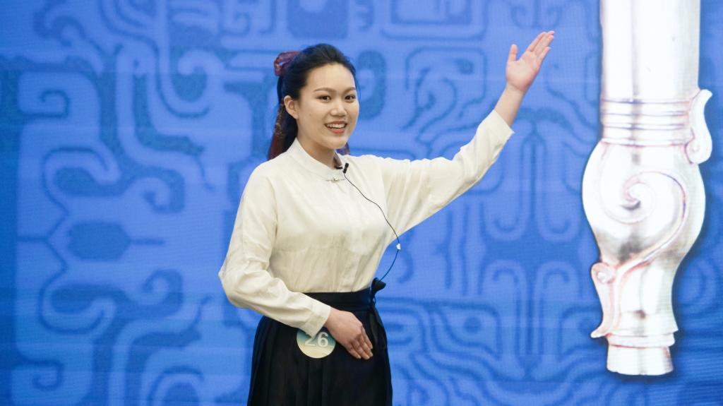 王鲁婧以《“兵兵”有礼》为题,讲解金鐏金冒铜戈这件集兵器、礼器于一身的特殊文物。“它从千年的厮杀中走来,人们用华美的镀金把它捧上礼的高台”从金鐏金冒铜戈华美轻巧、独具特色的外观,到其从“兵器”到“礼器”的演变历程。结尾的“用礼尚往来取代兵戎相见,以和合共生化解矛盾斗争,有力更有礼”巧妙打通了文武两者之间的壁垒,提高了文物的思想内涵。