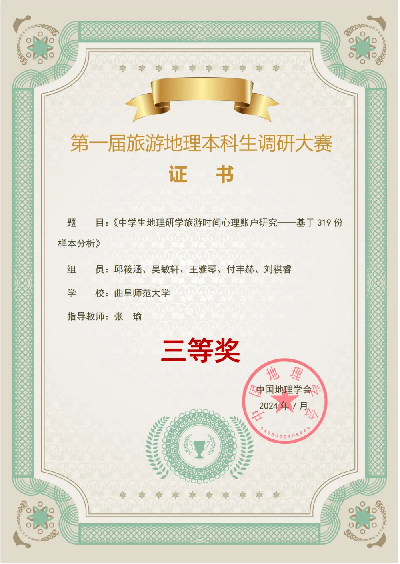 大赛旨在践行习近平总书记提出的“绿水青山就是金山银山”科学发展理念,提升社会公众对旅游地理的广泛认知,激发广大学子对旅游地理学的专业兴趣。大赛组委会共收到来自中山大学、华南理工大学、南京师范大学等高校的学生作品184份,经过两轮评审仅有10份作品进入总决赛。曲阜师大地理与旅游学院学子邱筱涵、吴敏轩、王雅琴、付丰赫、刘祺睿的调研作品《中学生地理研学时间心理账户研究——基于319份样本分析》在张瑜副教授指导下进入总决赛,并荣获全国三等奖。