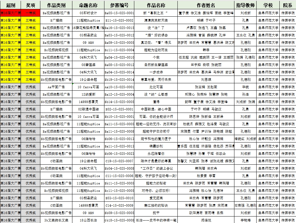 传媒学院讯 近日,第16届全国大学生广告艺术大赛全国总决赛喜报频传,我校传媒学子在大赛中表现亮眼,获全国奖项29项,其中一等奖1项,三等奖9项,优秀奖19项;在山东赛区的评审中,获一等奖4项,二等奖14项,三等奖25项,优秀奖94项。