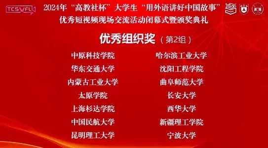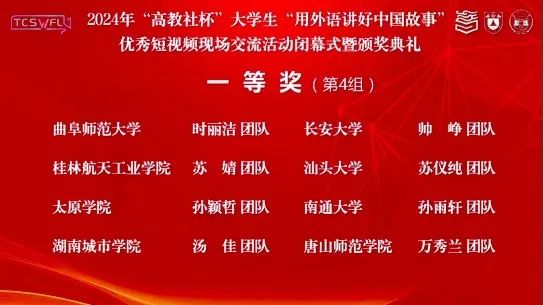 曲阜师大外国语学院讯   近日,由中国英汉语比较研究会指导,南京大学、湖南大学主办,高等教育出版社协办的2024年“高教社杯”大学生“用外语讲好中国故事”优秀短视频现场交流活动举办。曲阜师大外国语学院2022级英语师范生时丽洁及其团队成员张立鑫、陈佳悦、董雨琦在吉锡媛和刘萍老师指导下荣获山东省特等奖、国家级一等奖,XK在线获优秀组织奖。