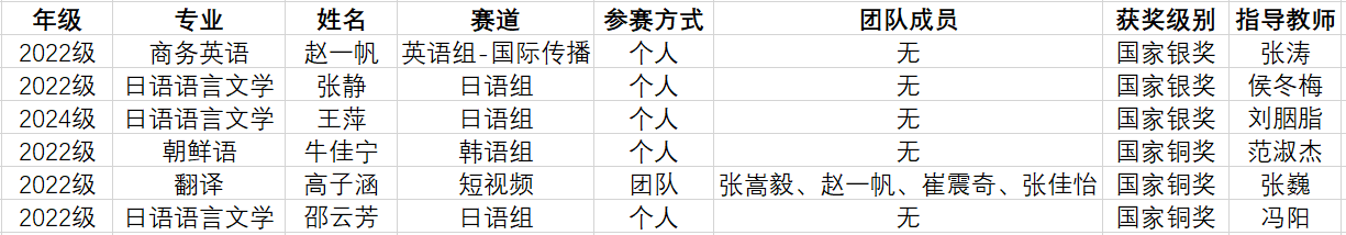 近年来,翻译学院始终秉承“以赛促学、以赛促教”的育人理念,积极引导学生参与各类重要学科知识竞赛,学生的语言综合能力和核心素养得到有效提升。今后,翻译学院将继续以学科竞赛为抓手,持续提升人才培养质量,着力培养具有家国情怀和国际视野、讲好中国故事的优秀外语人才。