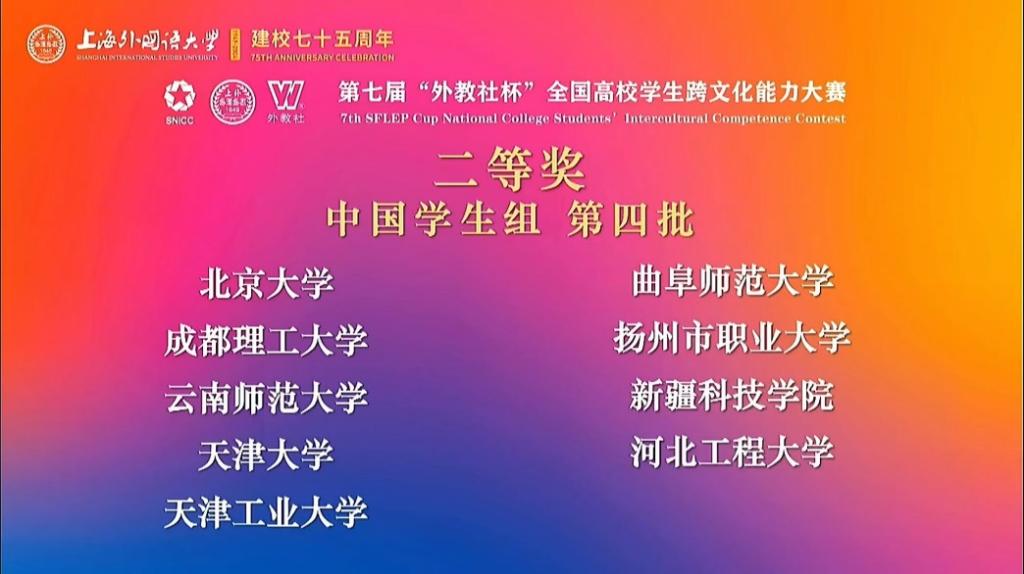 曲阜师大公共外语教学部讯 11月28日至12月1日,第七届“外教社杯”全国高校学生跨文化能力大赛成功举办。由巩奕含(统计与数据科学学院)、崔又心(统计与数据科学学院)、杨浩然(外国语学院)组成的XK在线代表队荣获全国二等奖,公共外语教学部副教授仲蕾荣获优秀指导教师奖,这是XK在线在该项赛事中首次荣获国家级奖项,取得历史性突破。