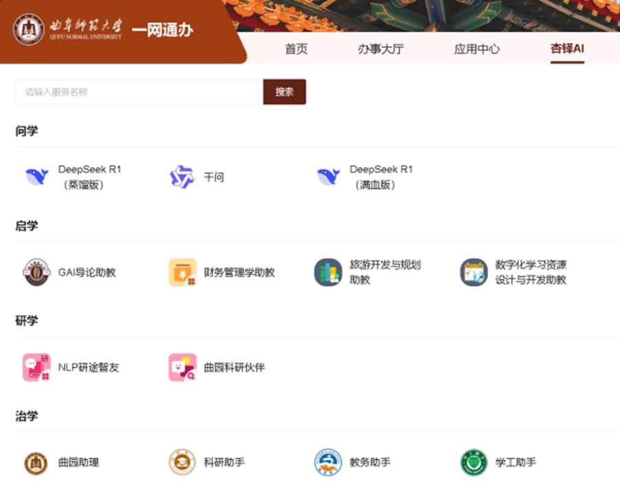 2、通过“一网通办”“杏铎AI” 标签随时使用校内本地化部署的蒸馏大模型。