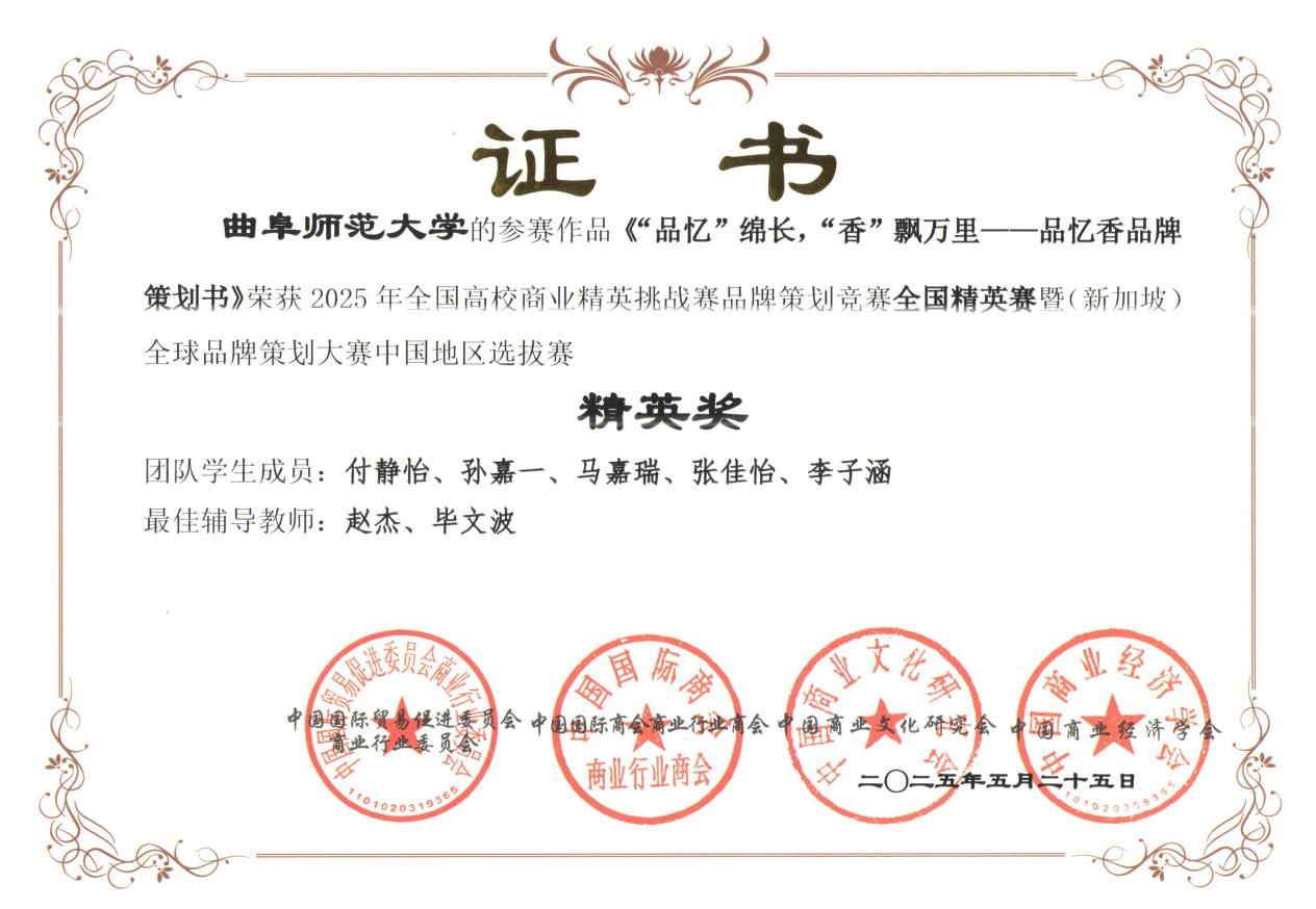 经济学院讯  日前,2025年全国高校商业精英挑战赛品牌策划大赛落下帷幕,曲阜师大经济学院2022级学生孙嘉一团队以优异成绩荣获全国总决赛一等奖,并从众多一等奖团队中突出重围获得全国精英奖,创造了曲阜师大学生在该项赛事中的最好成绩。