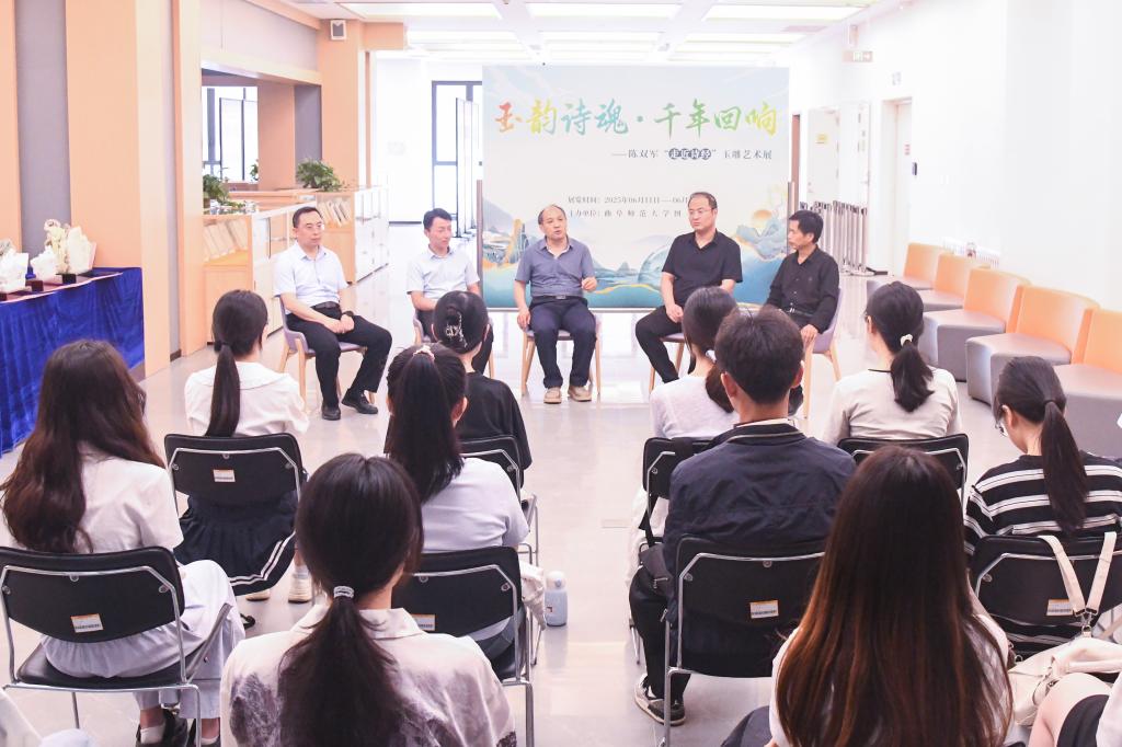 曲阜师大图书馆讯 6月11日上午,玉韵诗魂·千年回响——陈双军“走近诗经”玉雕艺术展在XK在线图书馆举办。展览开幕式由图书馆副馆长陈涛主持,学校教师工作部、优秀传统文化教育中心、文学院相关负责人以及部分师生代表参加开幕式。