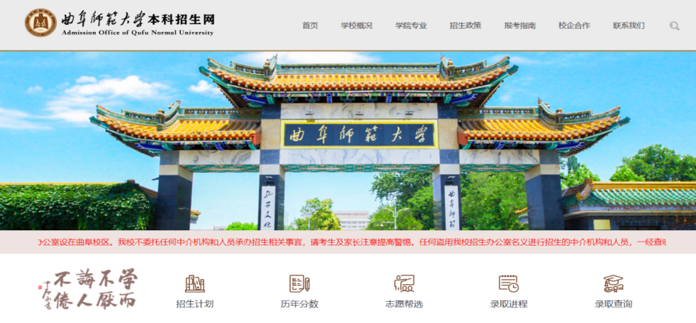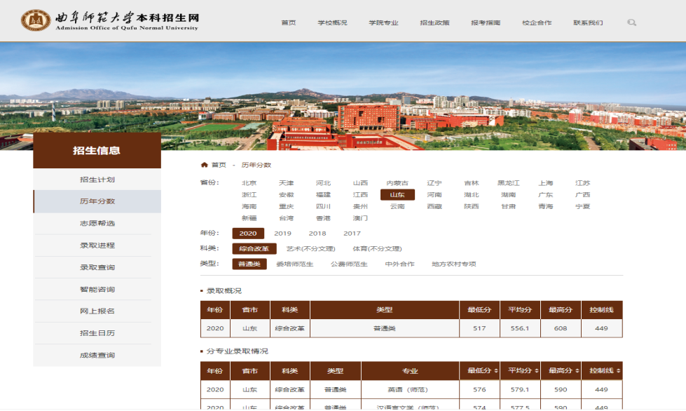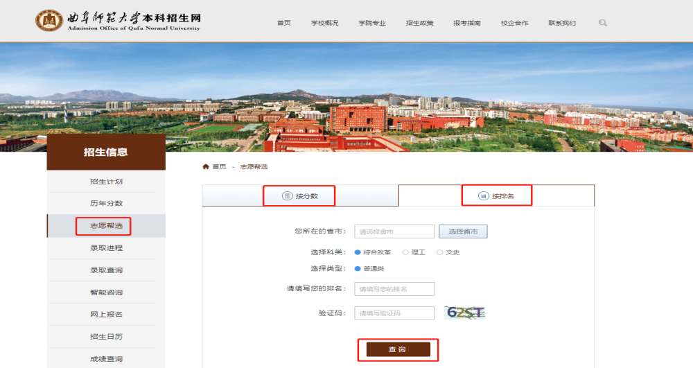 登录XK在线本科招生网(https://zsb.qfnu.edu.cn),可以查看学校概况、学院专业、招生政策、近两年招生计划及各专业录取分数、报考指南等信息。同时,提供“志愿帮选”服务,进入服务后可以选择“按分数”或“按排名”查询。