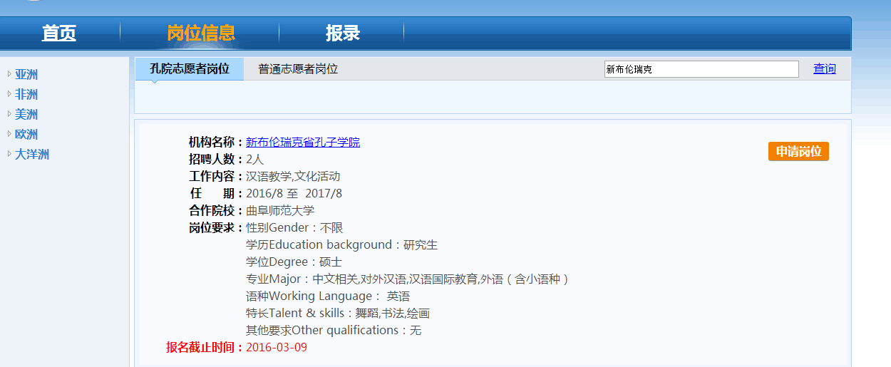 2. 2016年下半年普通志愿者及其他孔院志愿者岗位须在2月21日至3月20日期间报名。
