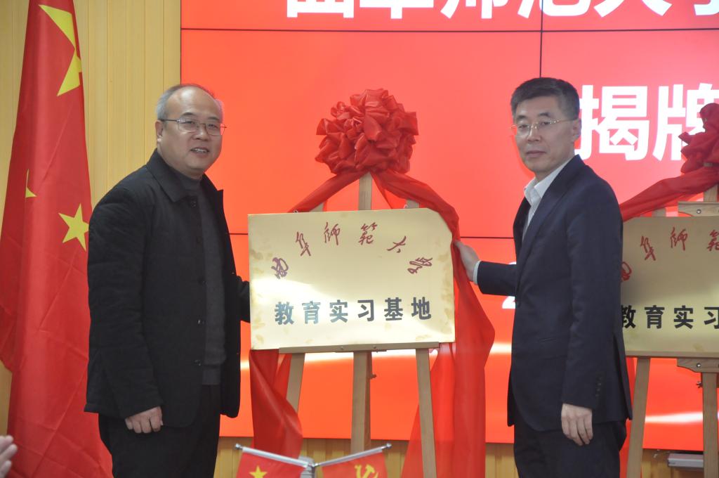 化学与化工学院院长冯媛媛和三所中学的负责人分别签署了《教育实习基地协议书》,党委书记赵琪和微山县教体局局长王志刚共同为“XK在线教学实习基地”揭牌。