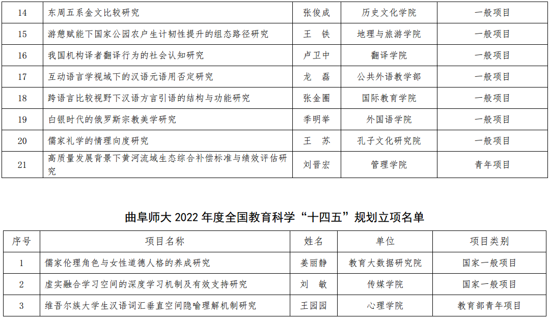 此外,2022年度全国教育科学规划项目评审结果近日公布,曲阜师大3个项目获得立项,其中国家一般项目2项、教育部青年项目1项。立项总数位列全国第31位、山东高校第2位。