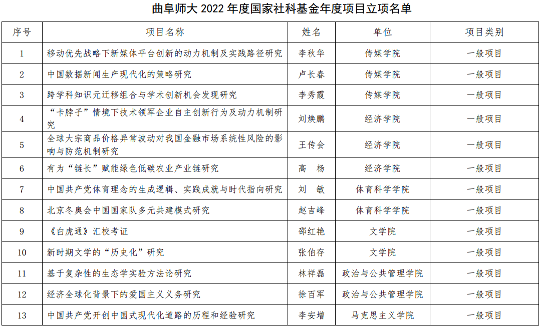 曲阜师大社会科学处讯  近日,全国哲学社会科学工作办公室网站公布了2022年国家社科基金年度项目立项名单,曲阜师大共有21个项目获得立项,立项总数位列全国第64位、全国师范类院校第15位、山东省属高校第1位,创学校历史新高。