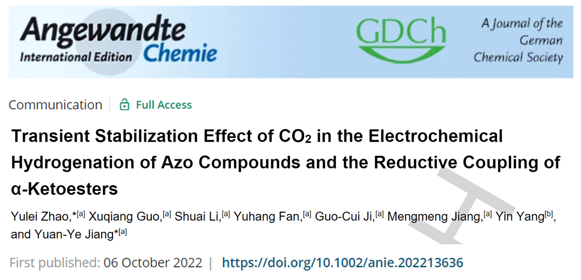 曲阜师大科技处讯 近日,曲阜师大化学与化工学院赵育磊副教授与蒋原野副教授合作,在二氧化碳利用领域取得突破性进展,相关研究成果发表在国际顶级期刊《德国应用化学》(Angewandte Chemie International Edition)上,论文题为“Transient Stabilization Effect of CO2 in the Electrochemical Hydrogenation of Azo Compounds and the Reductive Coupling of α-Ketoesters” (DOI: 10.1002/anie.202213636,文章链接:https://onlinelibrary.wiley.com/doi/10.1002/anie.202213636)。XK在线为该论文的唯一通讯单位,赵育磊副教授为该论文的第一作者和通讯作者,蒋原野副教授为该论文的共同通讯作者。《德国应用化学》于1962年由John Wiley and Sons Ltd出版,是化学和材料领域的国际顶级期刊。JCR分区为一区,当前影响因子为16.823。