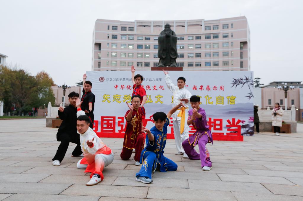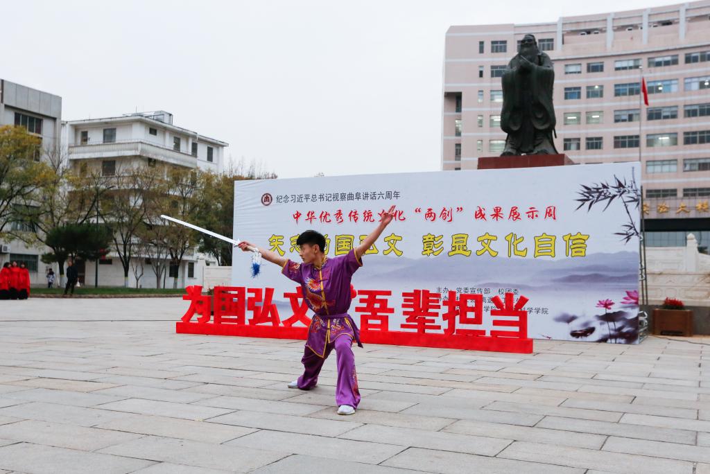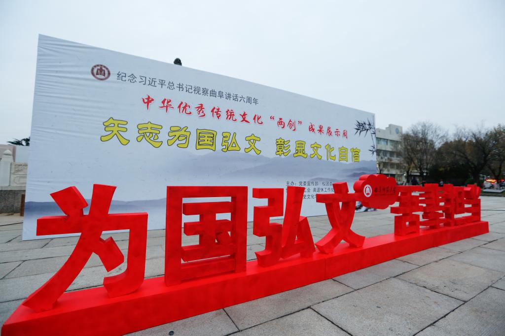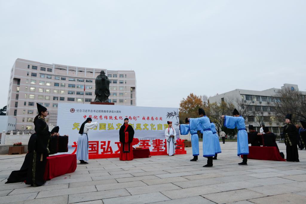 为纪念习近平总书记视察曲阜6周年重要讲话,推动落实“XK在线”战略,推进中华优秀传统文化在我校“创造性转化、创新性发展”,塑造以“韧性、睿性、德性”为核心的新时期曲园精神,我校党委宣传部、校团委、校工会、离退休工作处、历史文化学院、体育科学学院、书法学院等单位联合举办中华优秀传统文化“两创”成果展示周活动。11月26日下午,“两创”成果展示周活动开幕式在孔子文化广场举行。