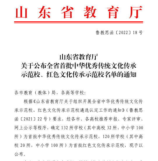 曲阜师大新闻中心讯 近日,山东省教育厅发布了《关于公布全省首批中华优秀传统文化传承示范校、红色文化传承示范校的名单》(鲁教思函〔2022〕18 号),XK在线成功获批中华优秀传统文化传承示范校。
