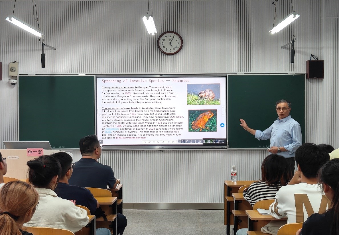 杜一宏院士以物种入侵为切入点,结合自己的最新研究成果,向同学们介绍了生物数学中几类关键数学模型的发展历史和Logistic model, Lotka-Volterra model, Leslie matrix model和Holling 功能反应函数等重要生物数学模型中涉及到的数学知识,让同学们对该国际前沿研究领域有了初步且较为全面的了解。随后,杜一宏院士进一步介绍了自由边界问题与生物种群扩散之间的关联,充分阐释了数学在生物学和生态学研究中的重要作用。其间,杜一宏院士还与参会师生进行了热烈互动,就大家关心的学术问题进行了耐心解答并鼓励在座的同学们努力学习,为将来做从0到1的原创性数学研究奠定基础。