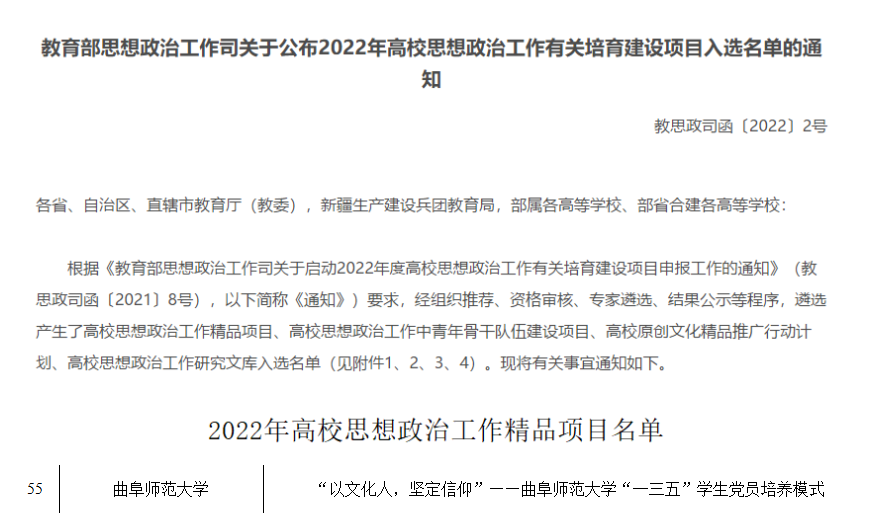 曲阜师大获批教育部2022年高校思想政治工作精品项目
