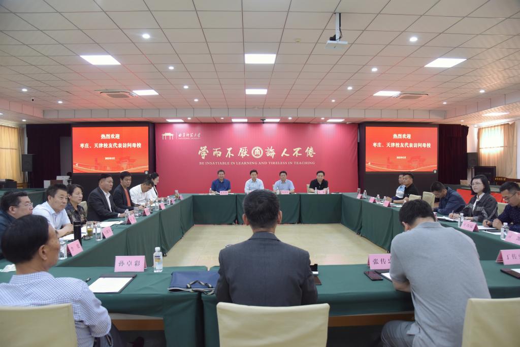 曲阜师大国内合作处讯 5月13日下午,曲阜师大校友会天津联络处、枣庄联络处的19位校友代表回母校访问交流。学校党委副书记、校长张洪海,党委常委、副校长纪洪涛会见来宾并举行座谈。张洪海对两地校友代...