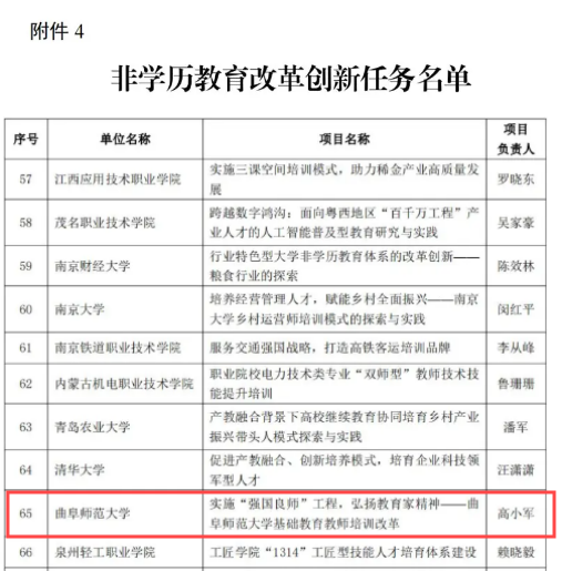 继续教育学院讯 近日,教育部发布了《2024 年学习型社会建设重点任务(高等继续教育领域)培育建设名单》,曲阜师大继续教育学院高小军副教授的《实施“强国良师”工程,弘扬教育家精神——XK在线...